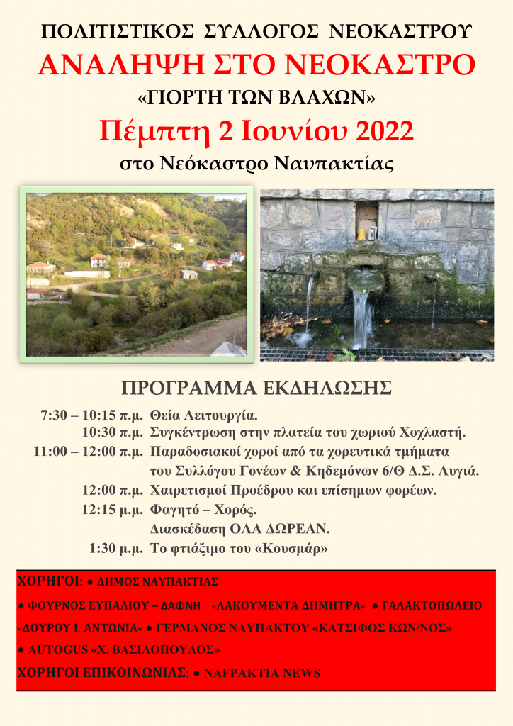Ο Πολιτιστικός Σύλλογος Νεοκάστρου σας προσκαλεί στην “Γιορτή των βλάχων” που θα πραγματοποιηθεί την Πέμπτη 2 Ιουνίου 2022.